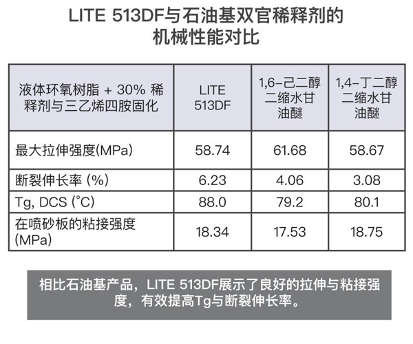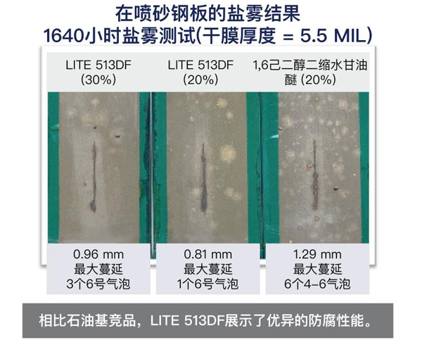 lite 513df是一款基于腰果殼油的新型高生物含量稀釋劑,它的環(huán)氧當量比標準的513型號要低。這款產品適用于環(huán)氧涂料、單組分和雙組分粘合劑以及復合材料。lite 513df粘度低,具有優(yōu)異的稀釋能力,與雙酚a型液體環(huán)氧樹脂的添加重量曲線如圖所示。作為稀釋劑,它在環(huán)境溫度和低溫下具有良好的硬度發(fā)展。與其他腰果殼油改性的材料類似,lite 513df具有良好的耐水性和柔韌性。在涂料應用中,lite 513df在長期鹽霧試驗中表現(xiàn)出非常好的防腐性能,請見本頁面板的圖片。在粘合劑應用中,這種環(huán)氧稀釋劑還可作為改性劑,提高伸長率和粘結強度,同時將對tg和抗拉強度的影響降至低。